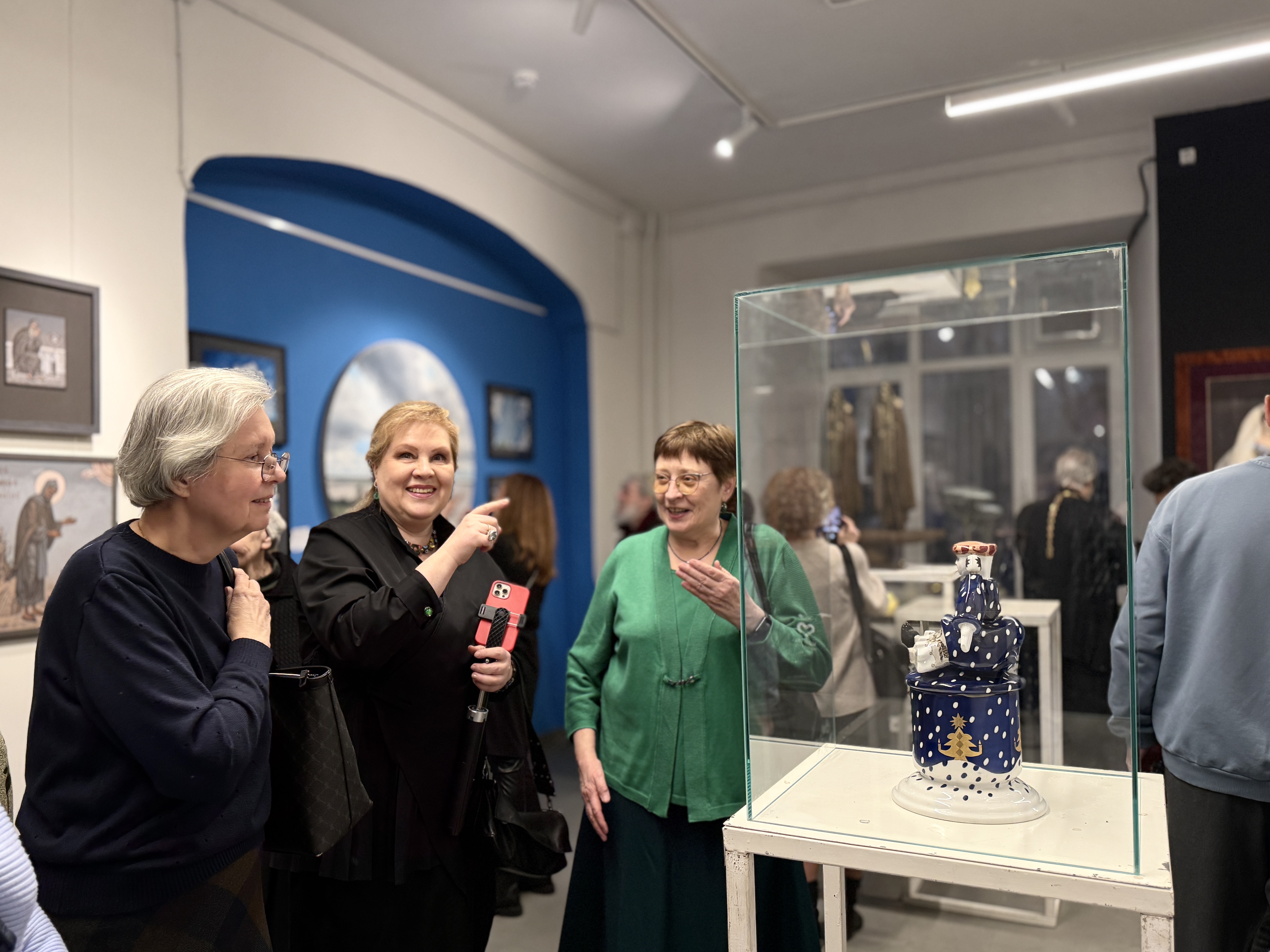 Живописные изображения святых старцев Николая Короткова находят объёмное продолжение в скульптурах Александра Смирнова, создавая гармоничное единство. Экспозицию дополняют яркие гобелены Альбины Воронковой, которые заряжают зрителя жизнерадостной энергией и придают выставке особую эмоциональную глубину. Проект воплощает не только визуальный, но и духовный опыт, включающий различные формы творческого выражения.